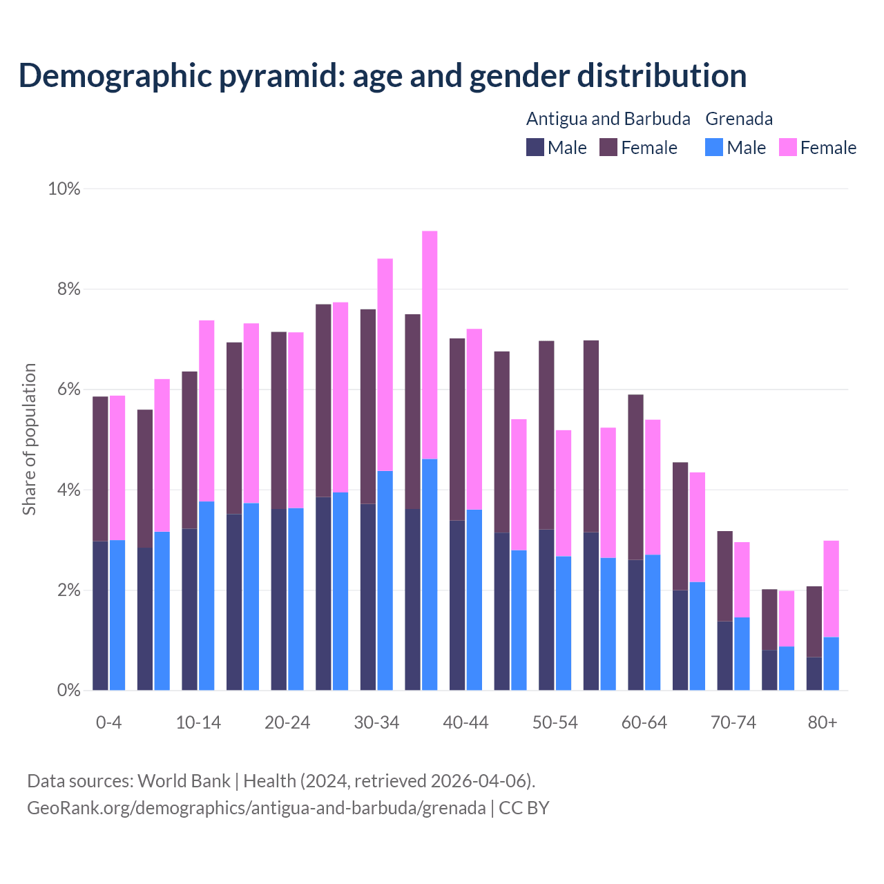 - Antigua and Barbuda is ranked 67/196 by median age (oldest to youngest) vs 77/196 for Grenada.