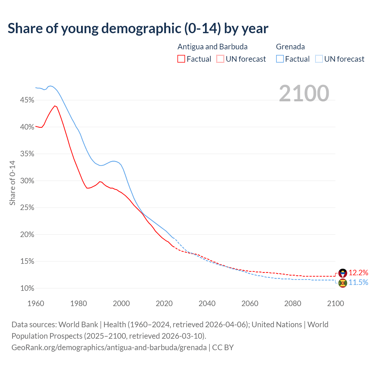 - The share of young demographic (0-15 years old) in Antigua and Barbuda is 17.8% vs 19.4% in Grenada.