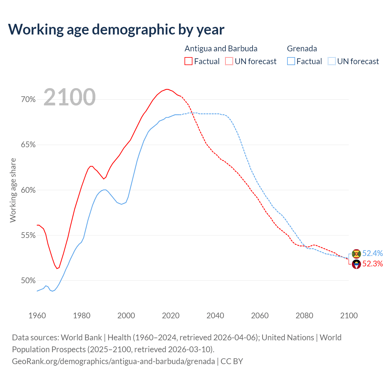 - Antigua and Barbuda has 66.7K working age adults (aged 15-64) vs 80.2K in Grenada.
