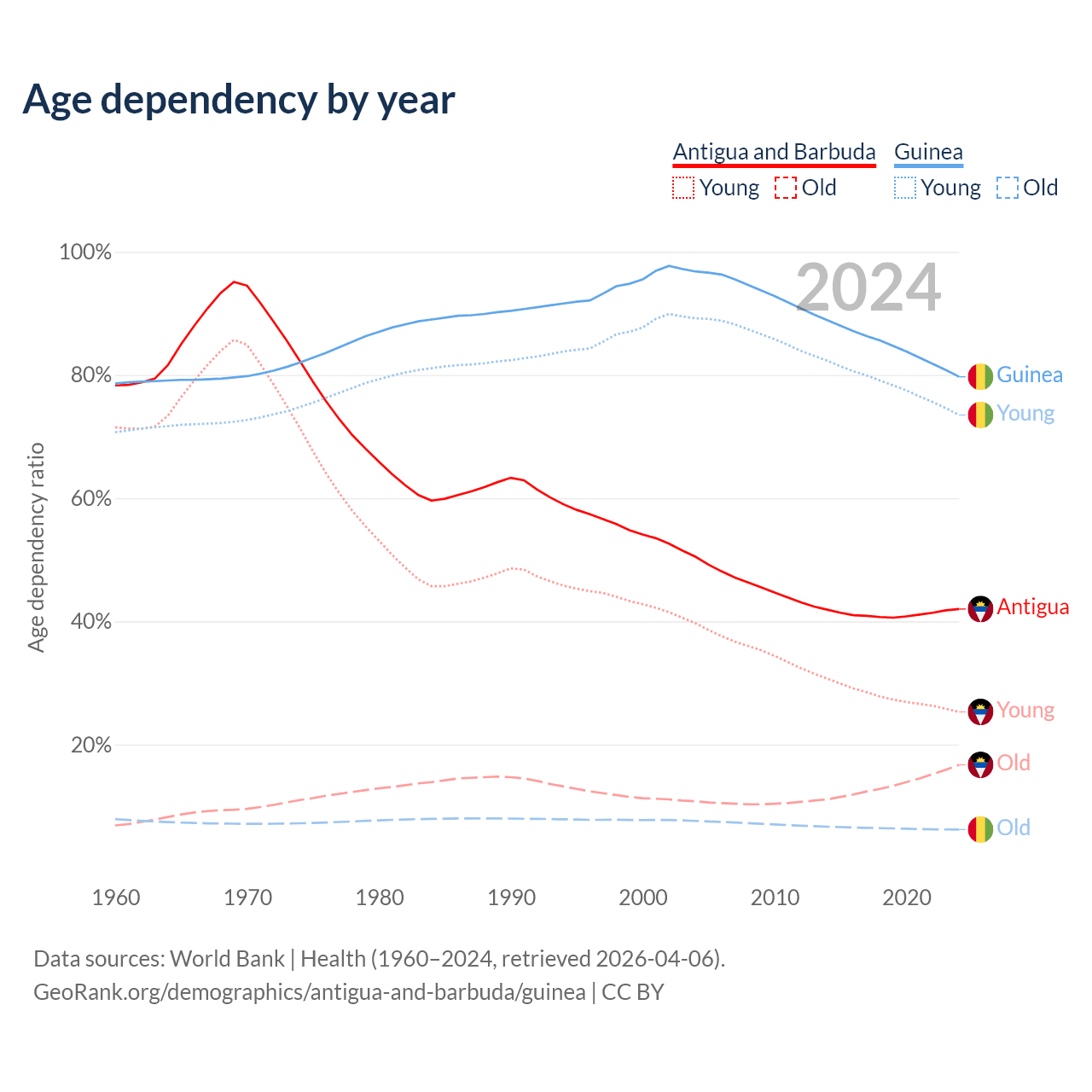- The share of old-age demographic (65+) in Antigua and Barbuda is 11.8% vs 3.46% in Guinea.