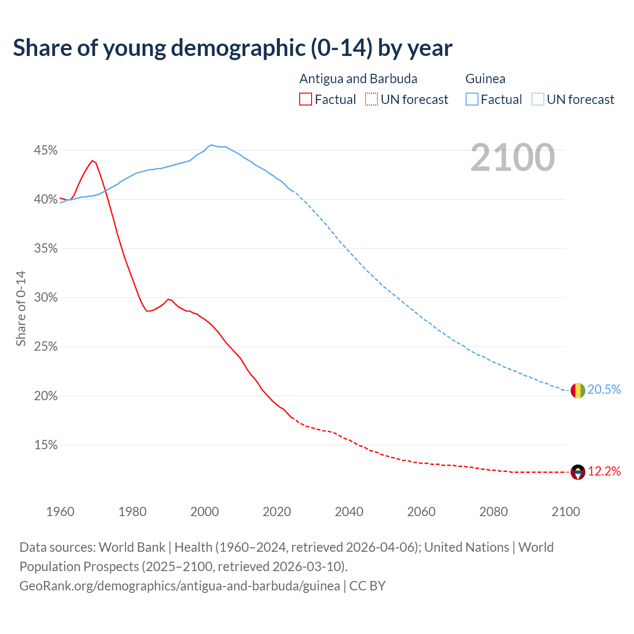 - The share of young demographic (0-15 years old) in Antigua and Barbuda is 17.8% vs 40.9% in Guinea.