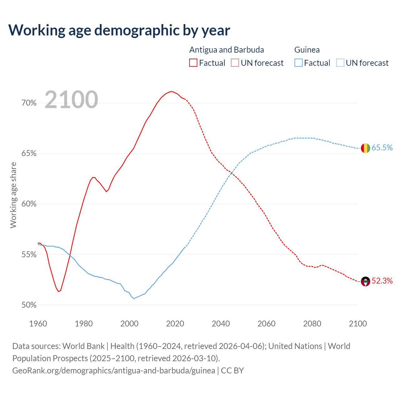 - Antigua and Barbuda has 66.7K working age adults (aged 15-64) vs 8.65M in Guinea.