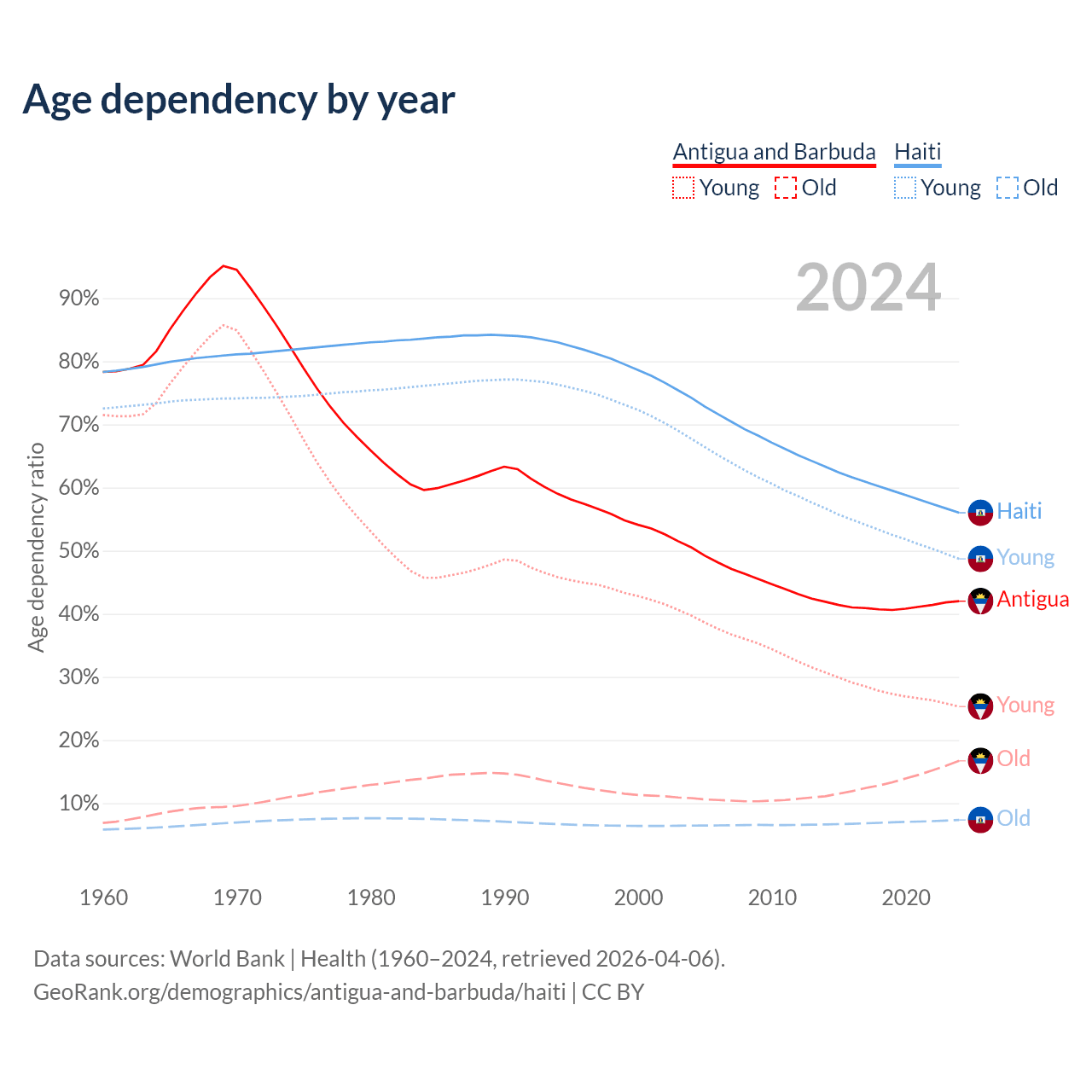 - Antigua and Barbuda is ranked 67/196 by median age (oldest to youngest) vs 135/196 for Haiti.