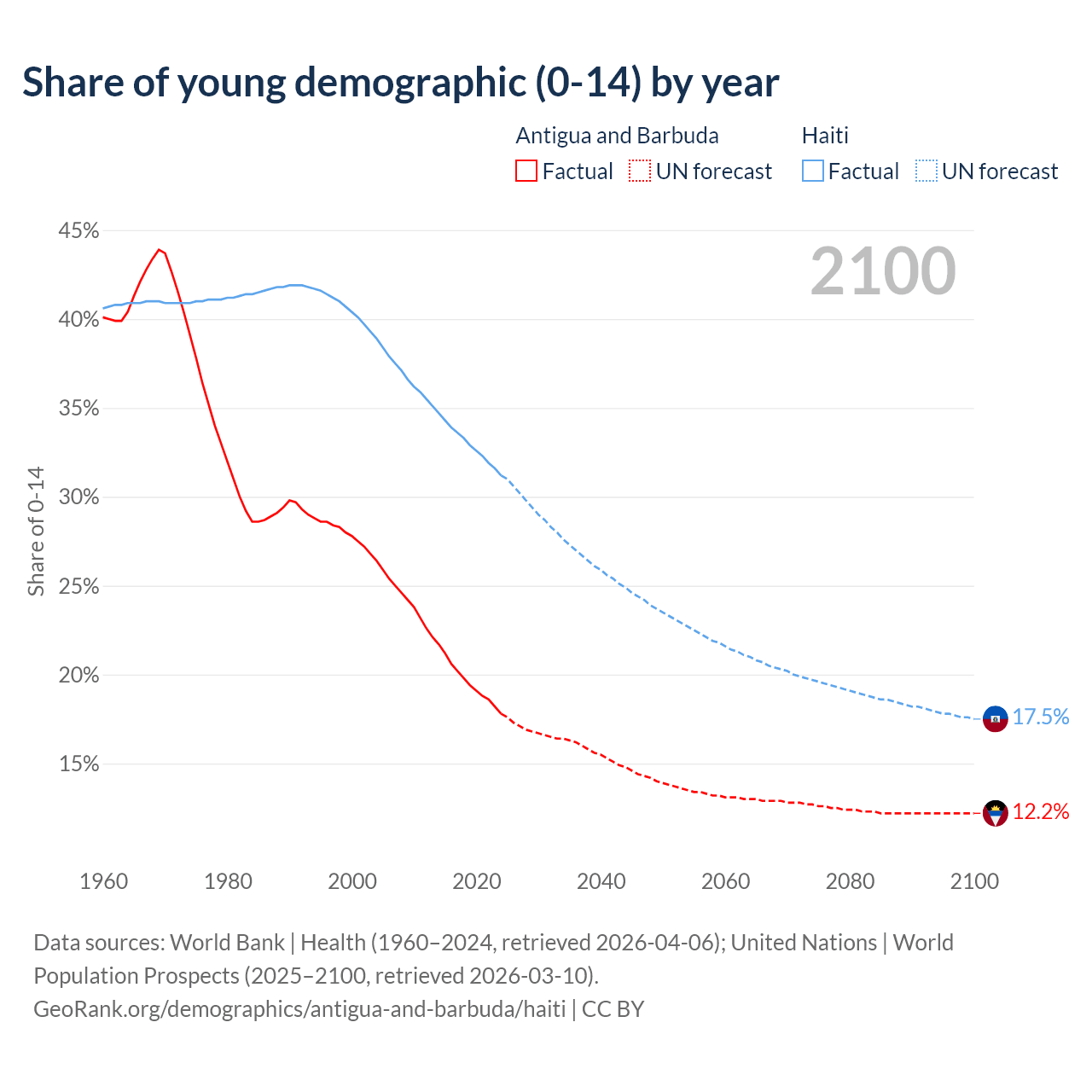 - The share of young demographic (0-15 years old) in Antigua and Barbuda is 17.8% vs 31.2% in Haiti.