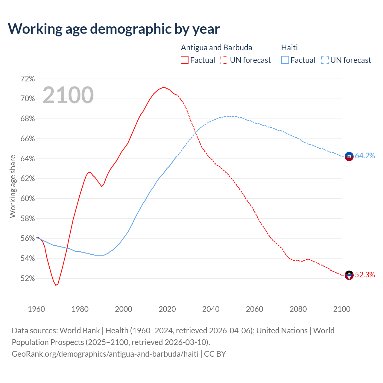 - Antigua and Barbuda has 66.7K working age adults (aged 15-64) vs 7.74M in Haiti.