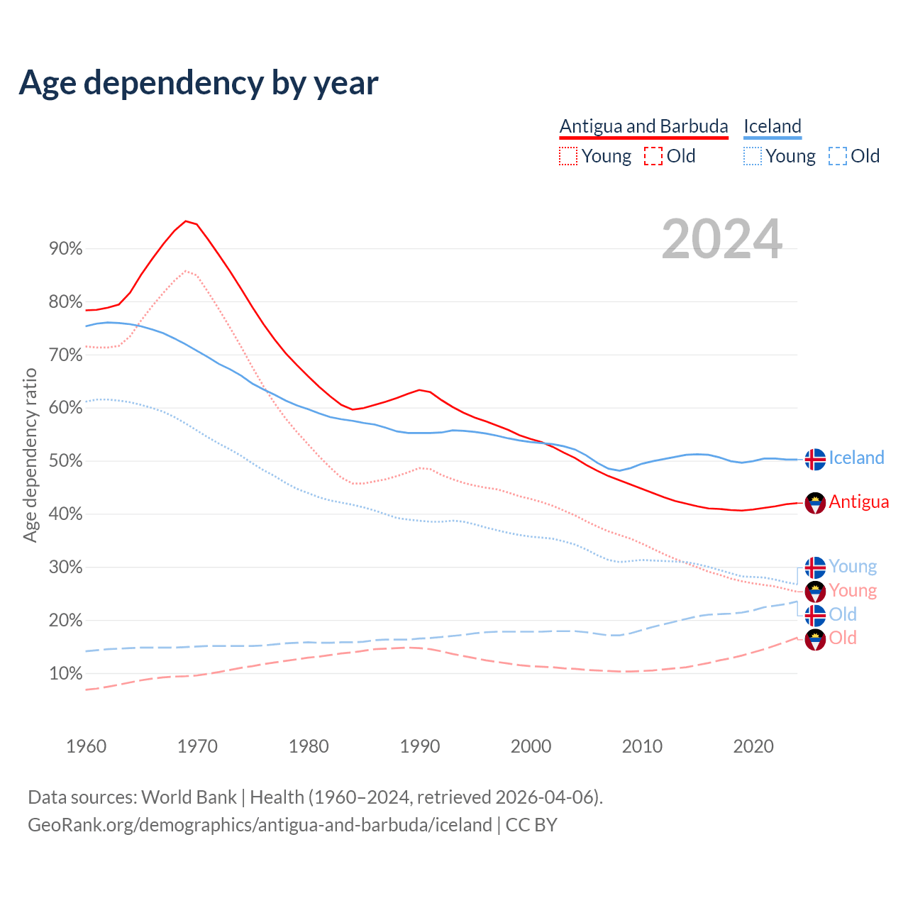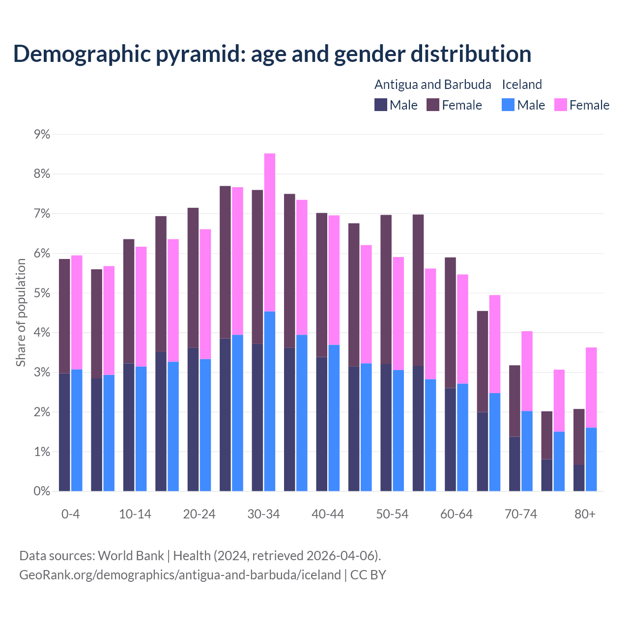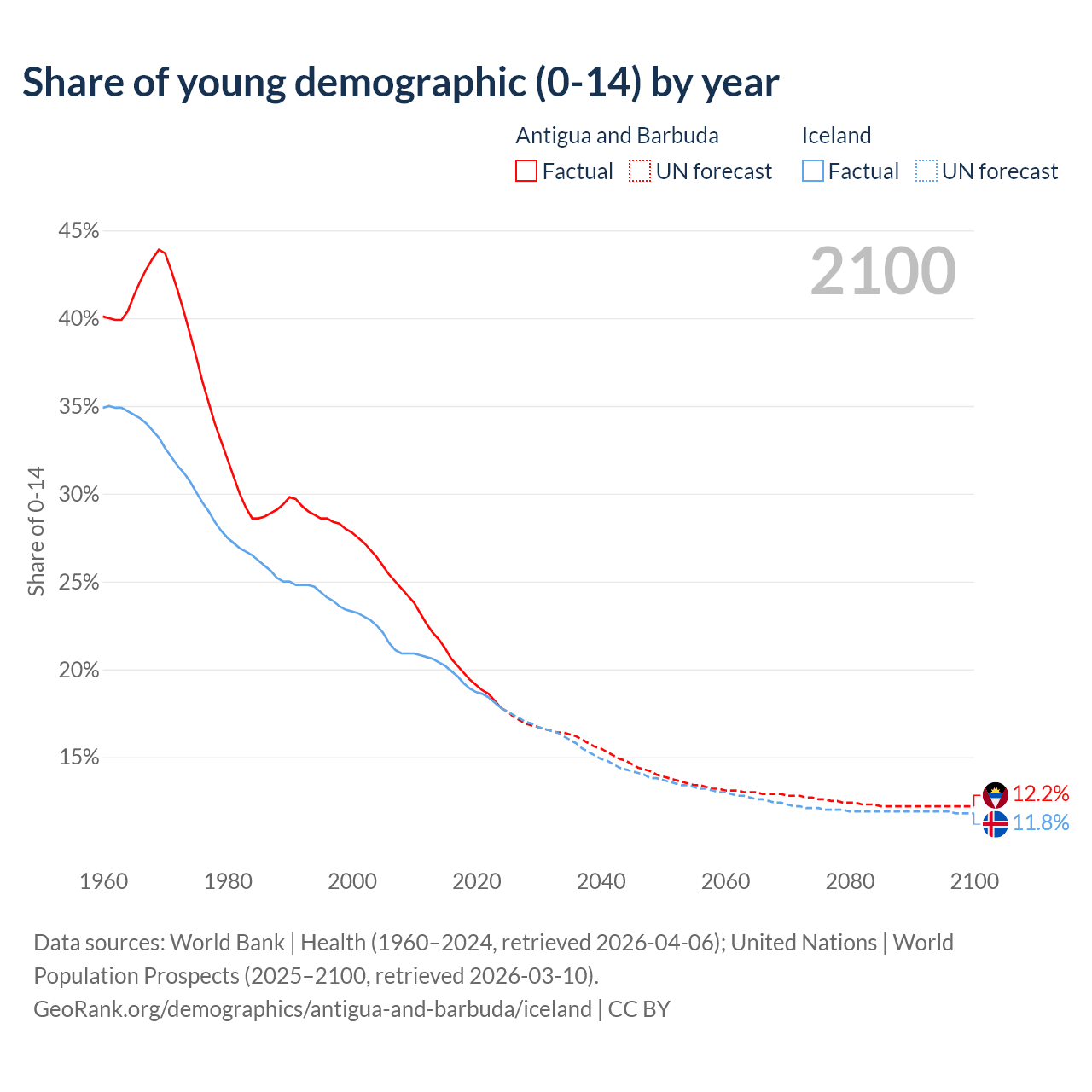- The share of young demographic (0-15 years old) in Antigua and Barbuda is 17.8% vs 17.8% in Iceland.