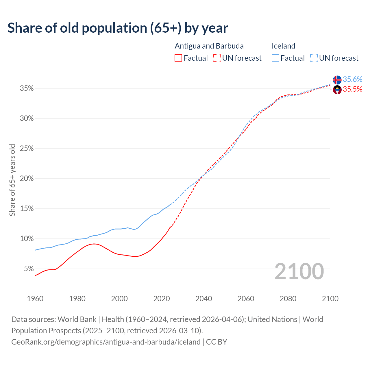 - The share of old-age demographic (65+) in Antigua and Barbuda is 11.8% vs 15.6% in Iceland.