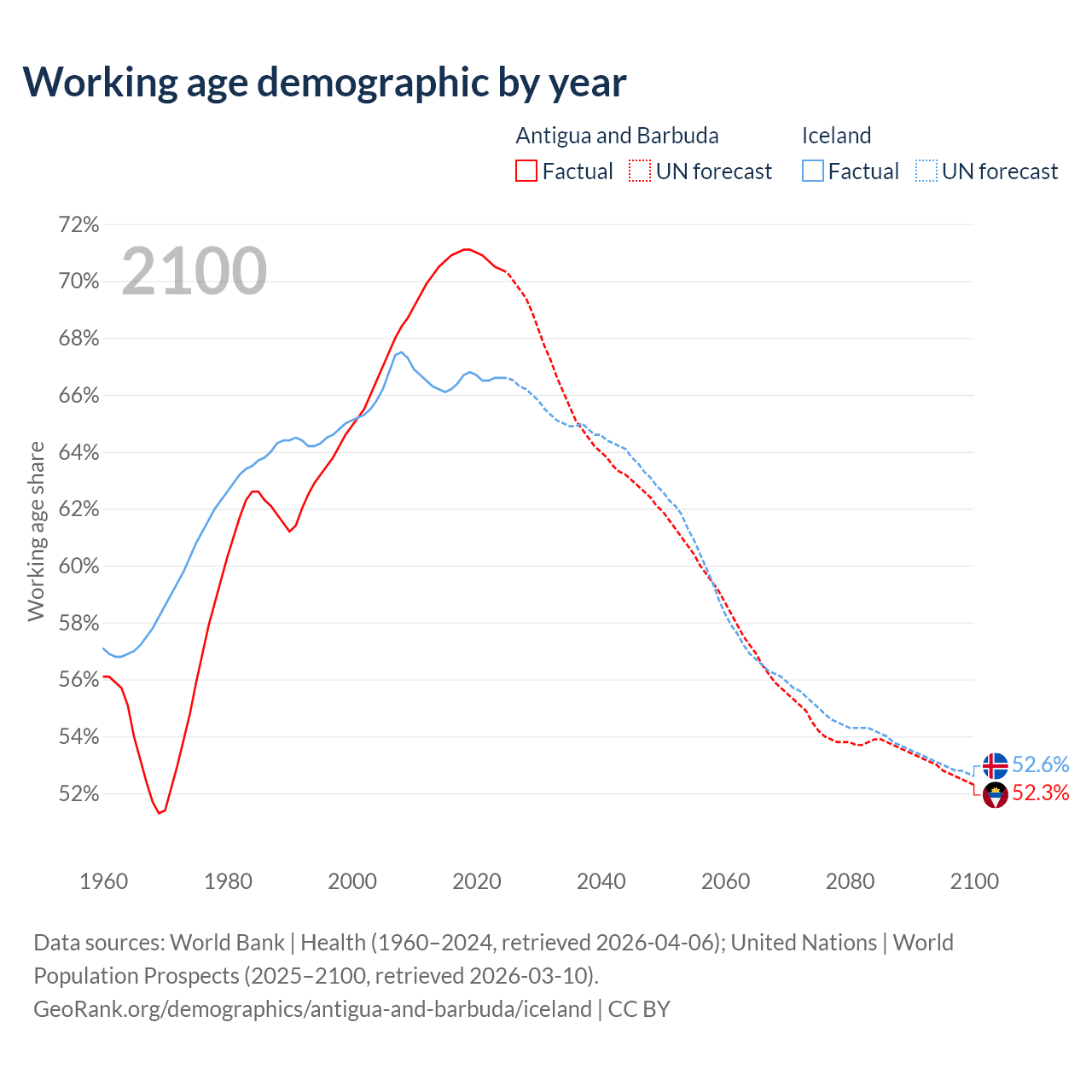 - Antigua and Barbuda has 66.7K working age adults (aged 15-64) vs 264K in Iceland.