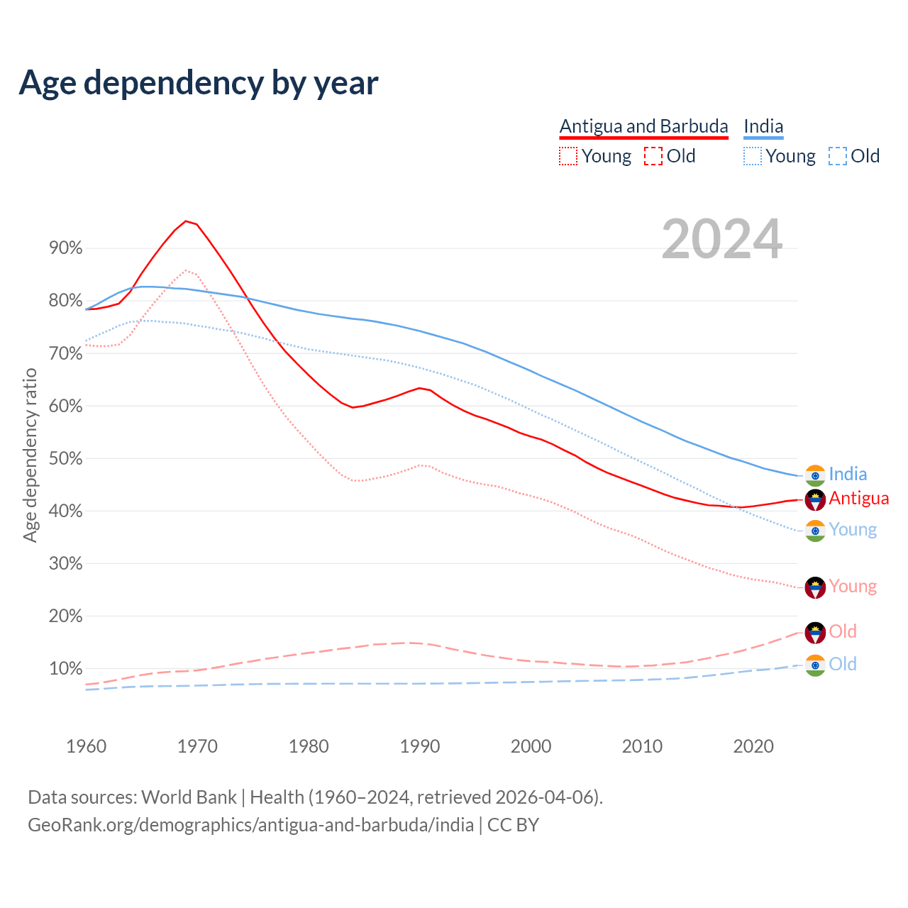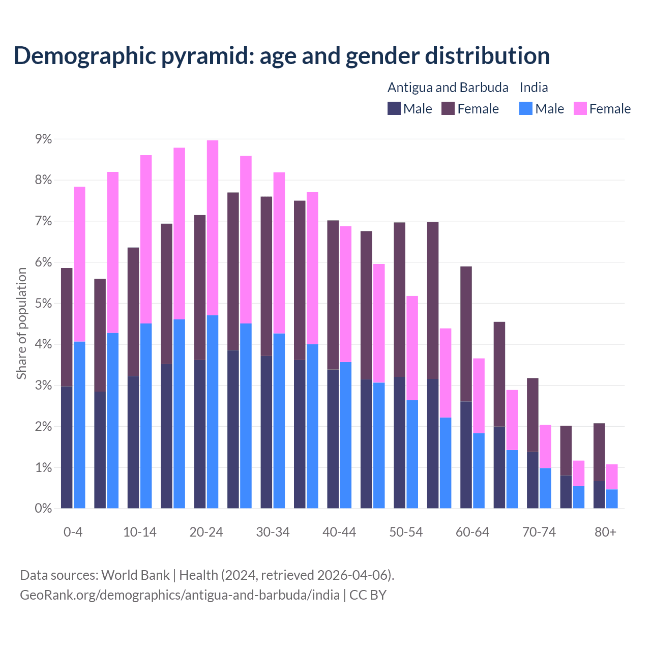 - Antigua and Barbuda is ranked 67/196 by median age (oldest to youngest) vs 108/196 for India.