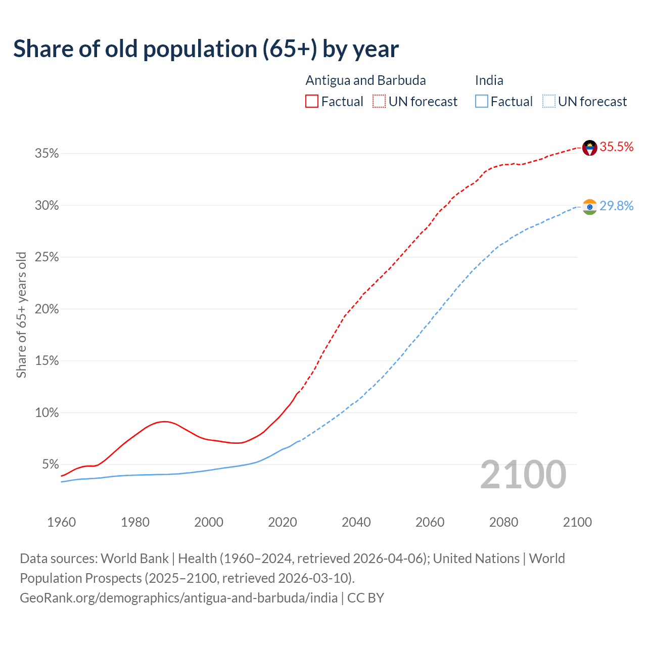 The share of older people aged 65 and over is 11.8% in Antigua and Barbuda and 7.15% in India. Life expectancy in Antigua and Barbuda compared to India .