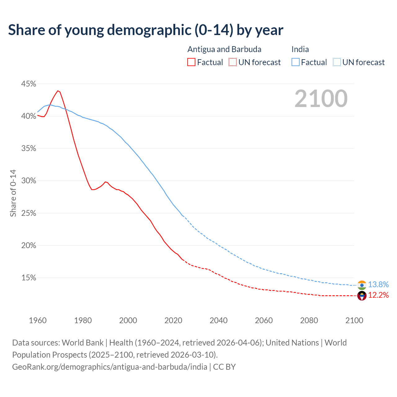 - The share of young demographic (0-15 years old) in Antigua and Barbuda is 17.8% vs 24.6% in India.