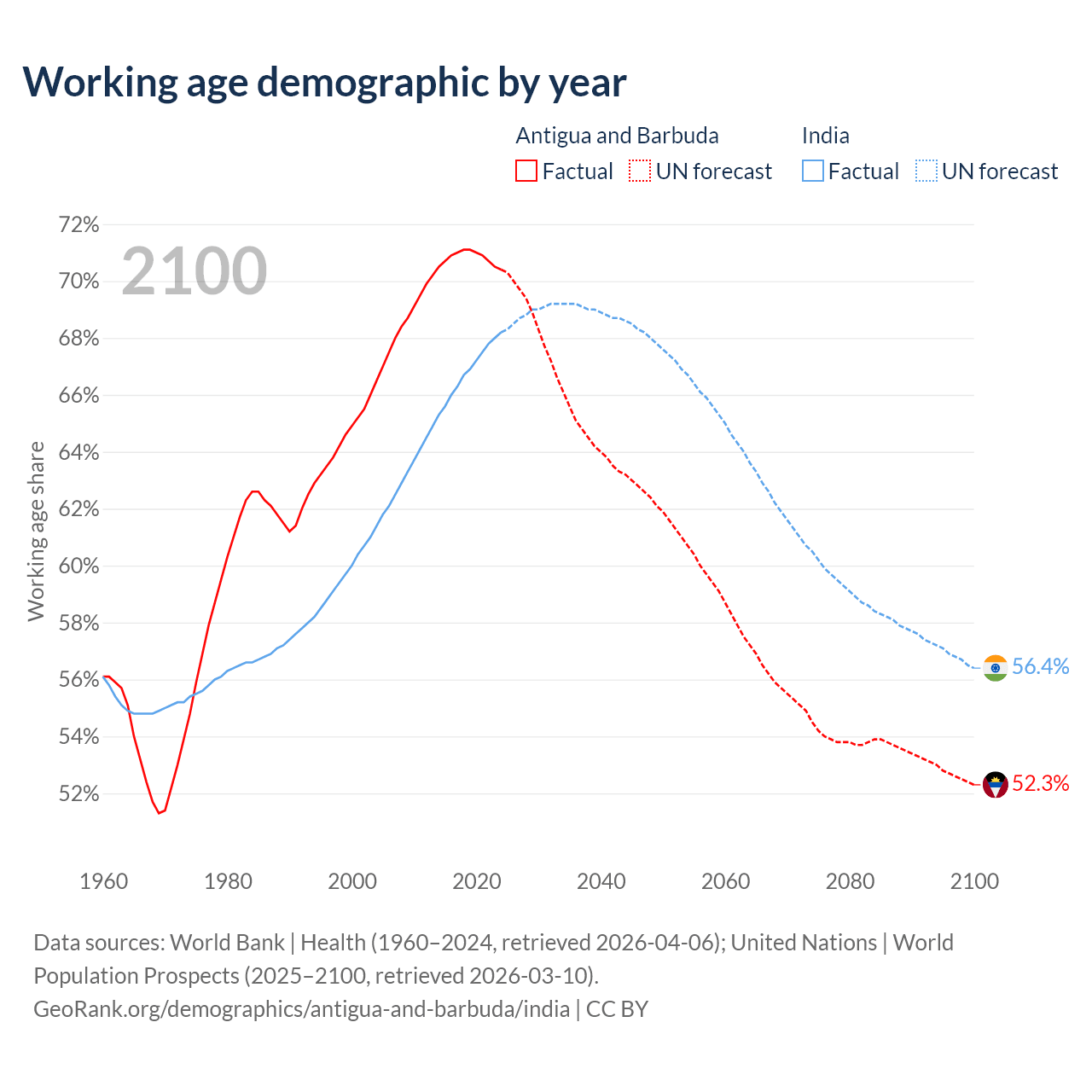 - Antigua and Barbuda has 66.7K working age adults (aged 15-64) vs 1.01B in India.