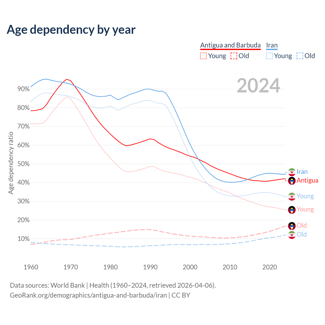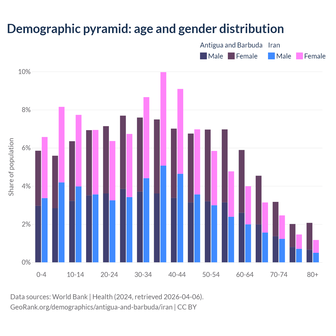 - The share of young demographic (0-15 years old) in Antigua and Barbuda is 17.8% vs 22.4% in Iran.