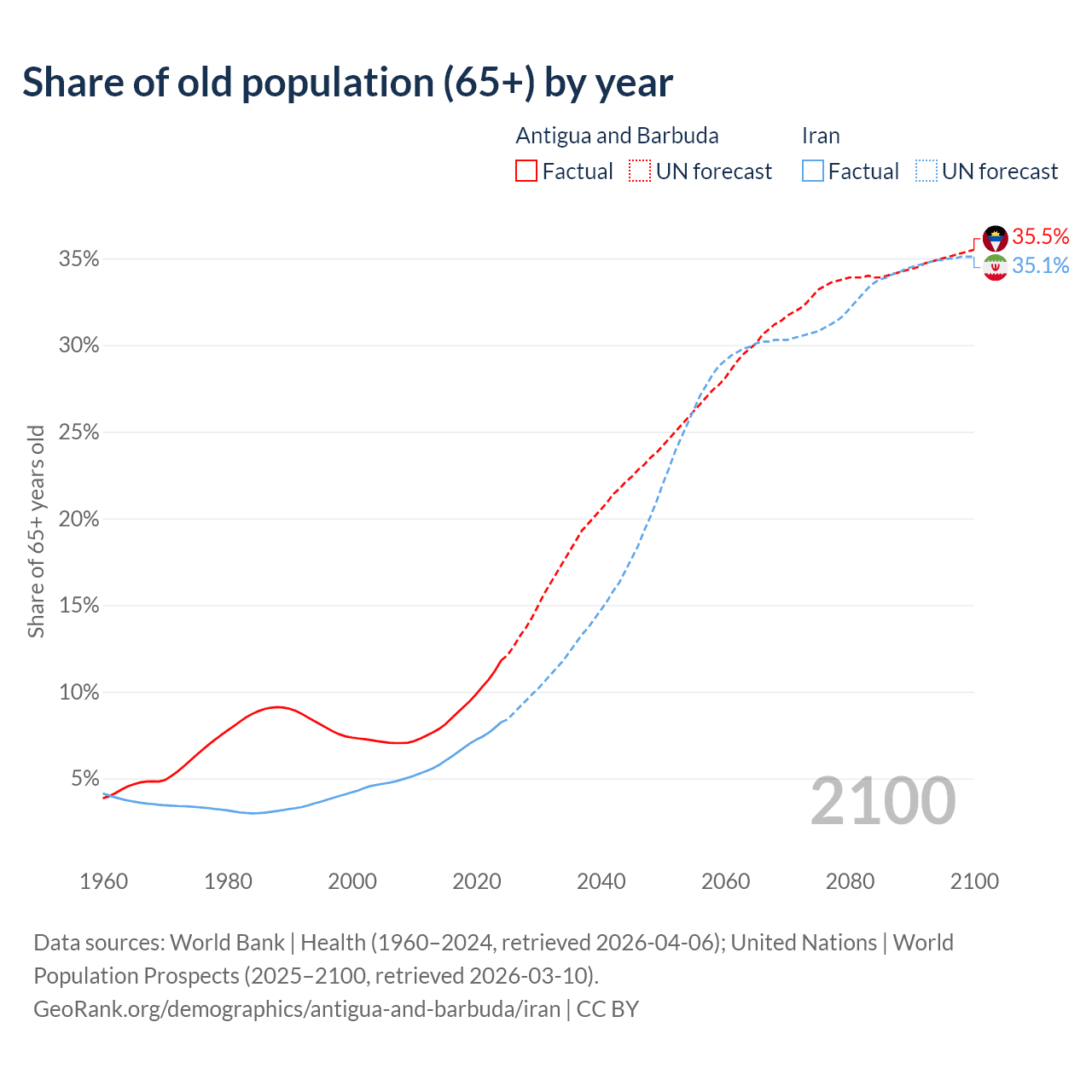 The share of older people aged 65 and over is 11.8% in Antigua and Barbuda and 8.24% in Iran. Life expectancy in Antigua and Barbuda compared to Iran .