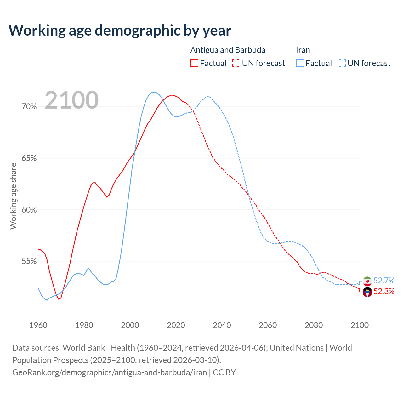 - Antigua and Barbuda has 66.7K working age adults (aged 15-64) vs 64.8M in Iran.