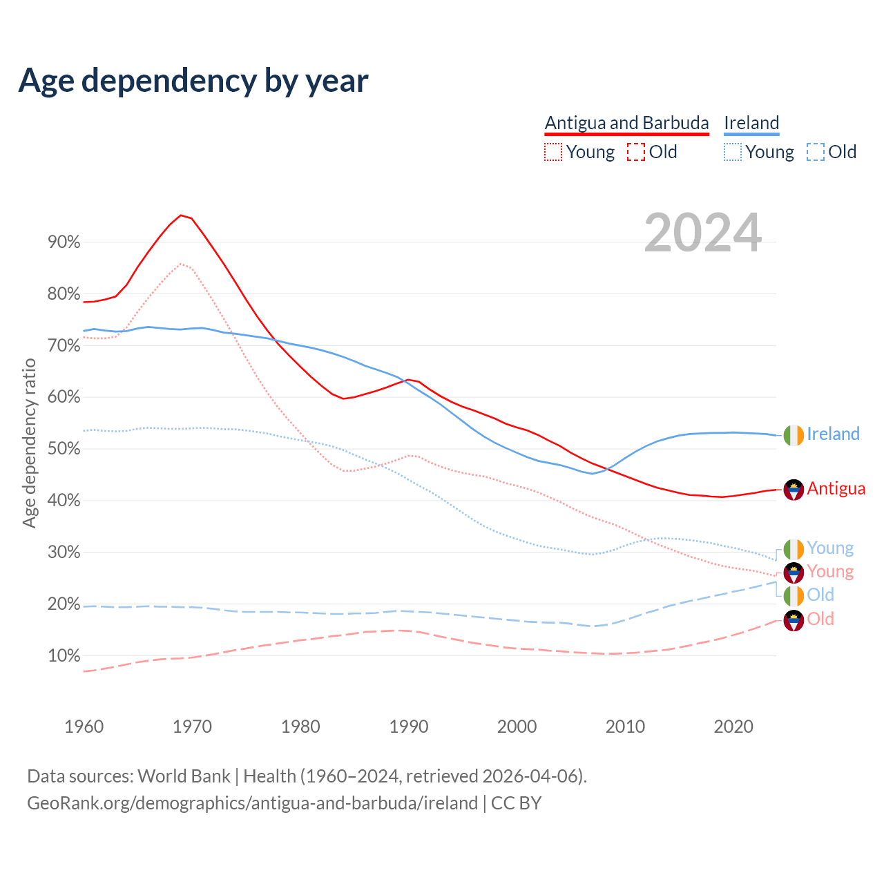 - Antigua and Barbuda is ranked 67/196 by median age (oldest to youngest) vs 48/196 for Ireland.