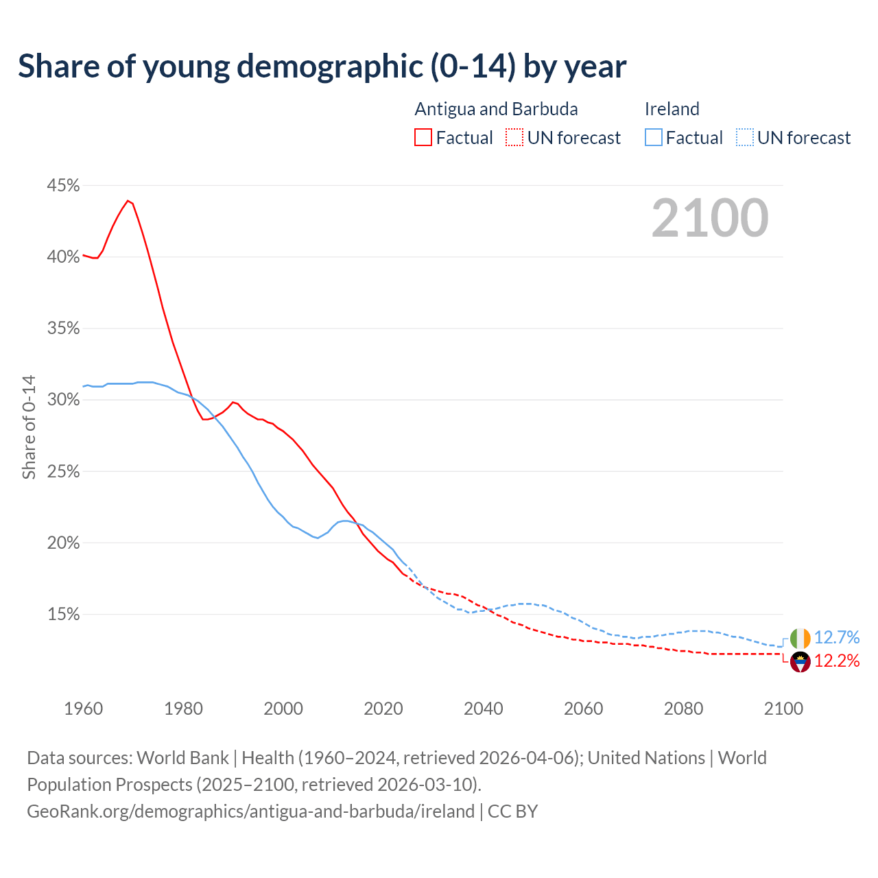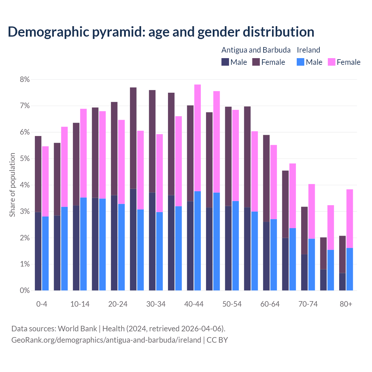 - The share of young demographic (0-15 years old) in Antigua and Barbuda is 17.8% vs 18.6% in Ireland.