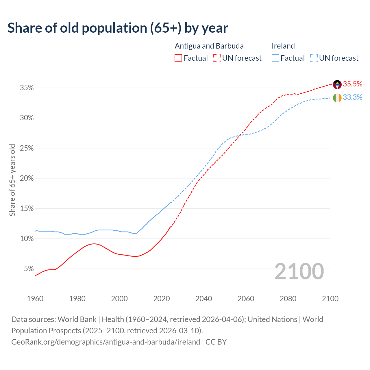 The share of older people aged 65 and over is 11.8% in Antigua and Barbuda and 15.9% in Ireland. Life expectancy in Antigua and Barbuda compared to Ireland .