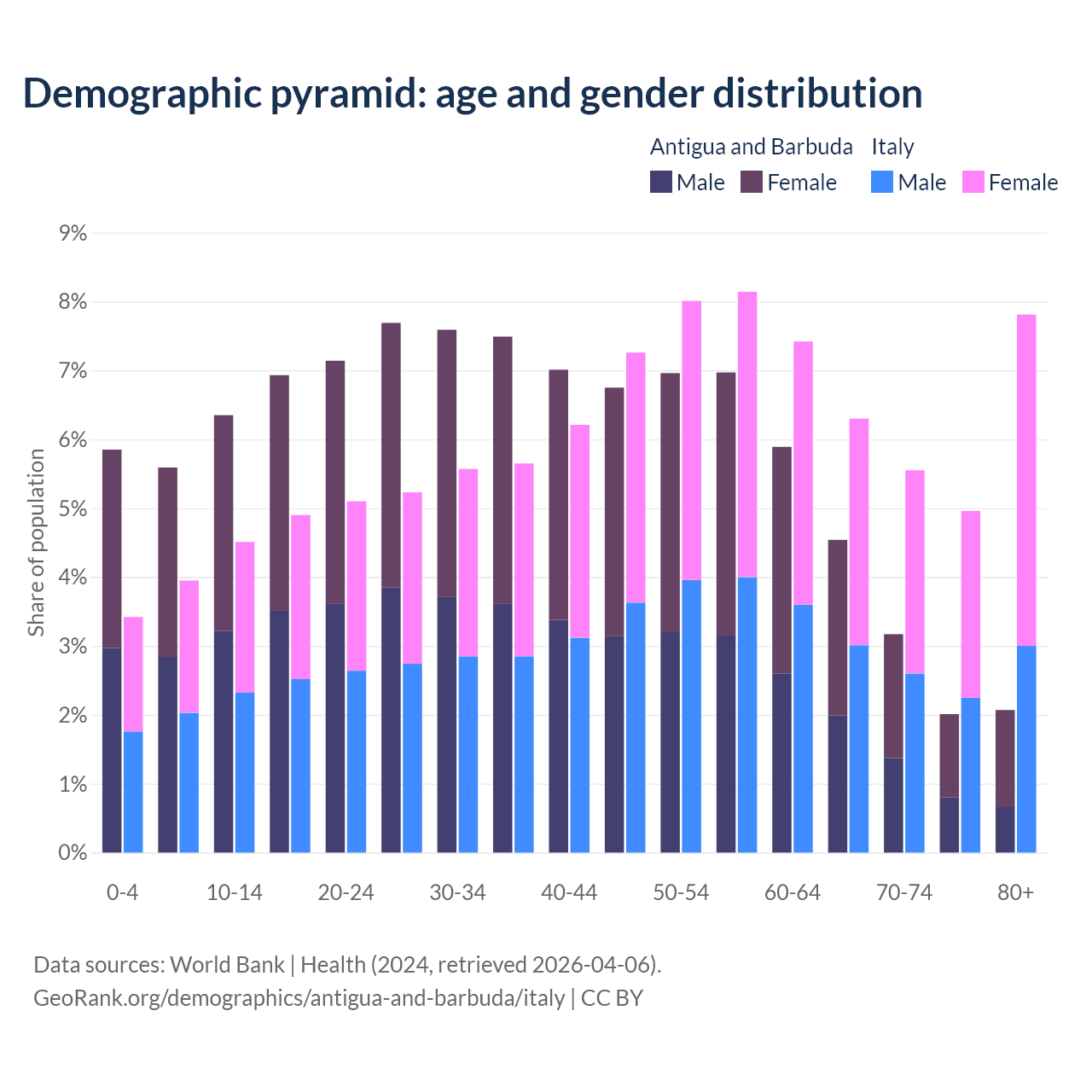 - Antigua and Barbuda is ranked 67/196 by median age (oldest to youngest) vs 4/196 for Italy.