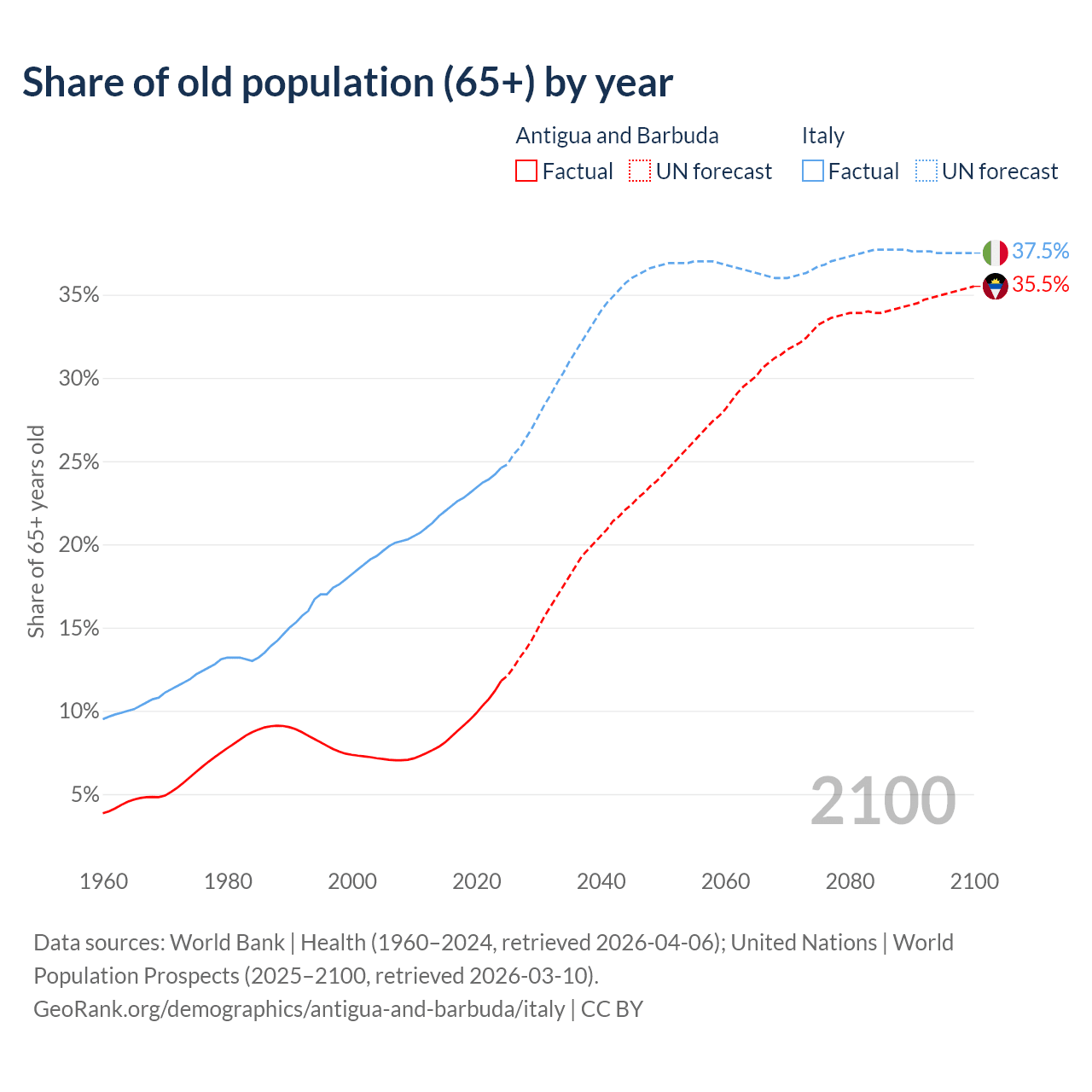 The share of older people aged 65 and over is 11.8% in Antigua and Barbuda and 24.6% in Italy. Life expectancy in Antigua and Barbuda compared to Italy .