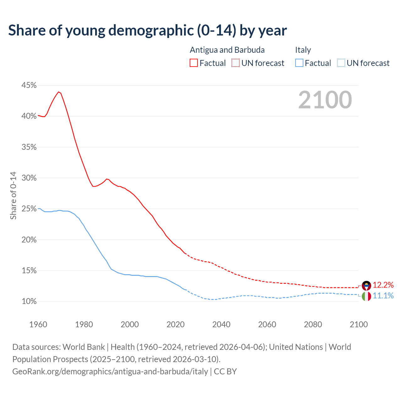 - The share of young demographic (0-15 years old) in Antigua and Barbuda is 17.8% vs 11.9% in Italy.