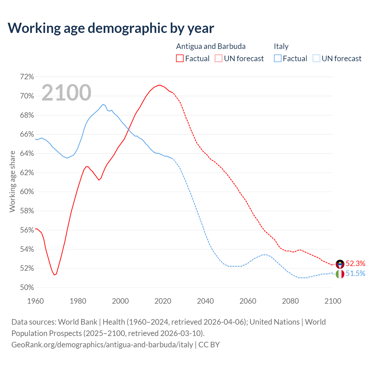 - Antigua and Barbuda has 66.7K working age adults (aged 15-64) vs 37.2M in Italy.