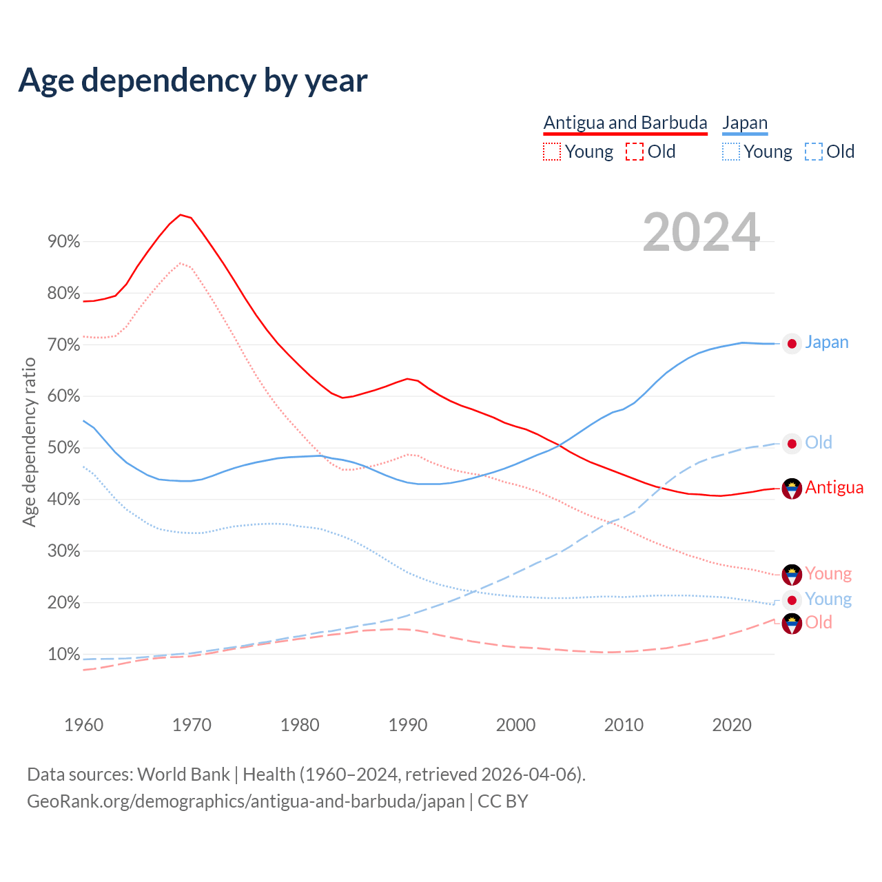 - Antigua and Barbuda is ranked 67/196 by median age (oldest to youngest) vs 2/196 for Japan.