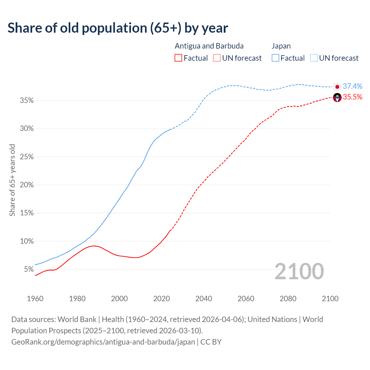 The share of older people aged 65 and over is 11.8% in Antigua and Barbuda and 29.8% in Japan. Life expectancy in Antigua and Barbuda compared to Japan .