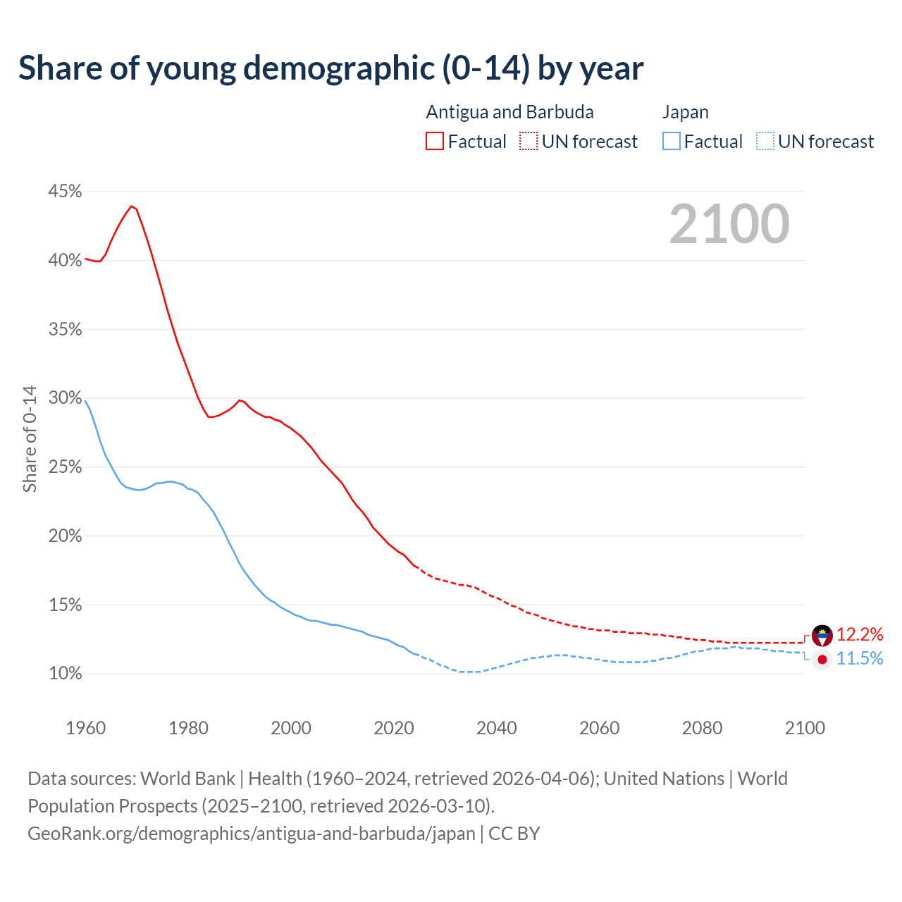 - The share of young demographic (0-15 years old) in Antigua and Barbuda is 17.8% vs 11.4% in Japan.