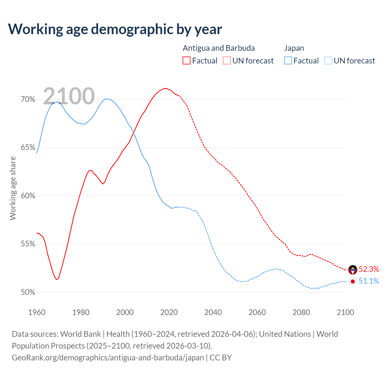 - Antigua and Barbuda has 66.7K working age adults (aged 15-64) vs 72.1M in Japan.