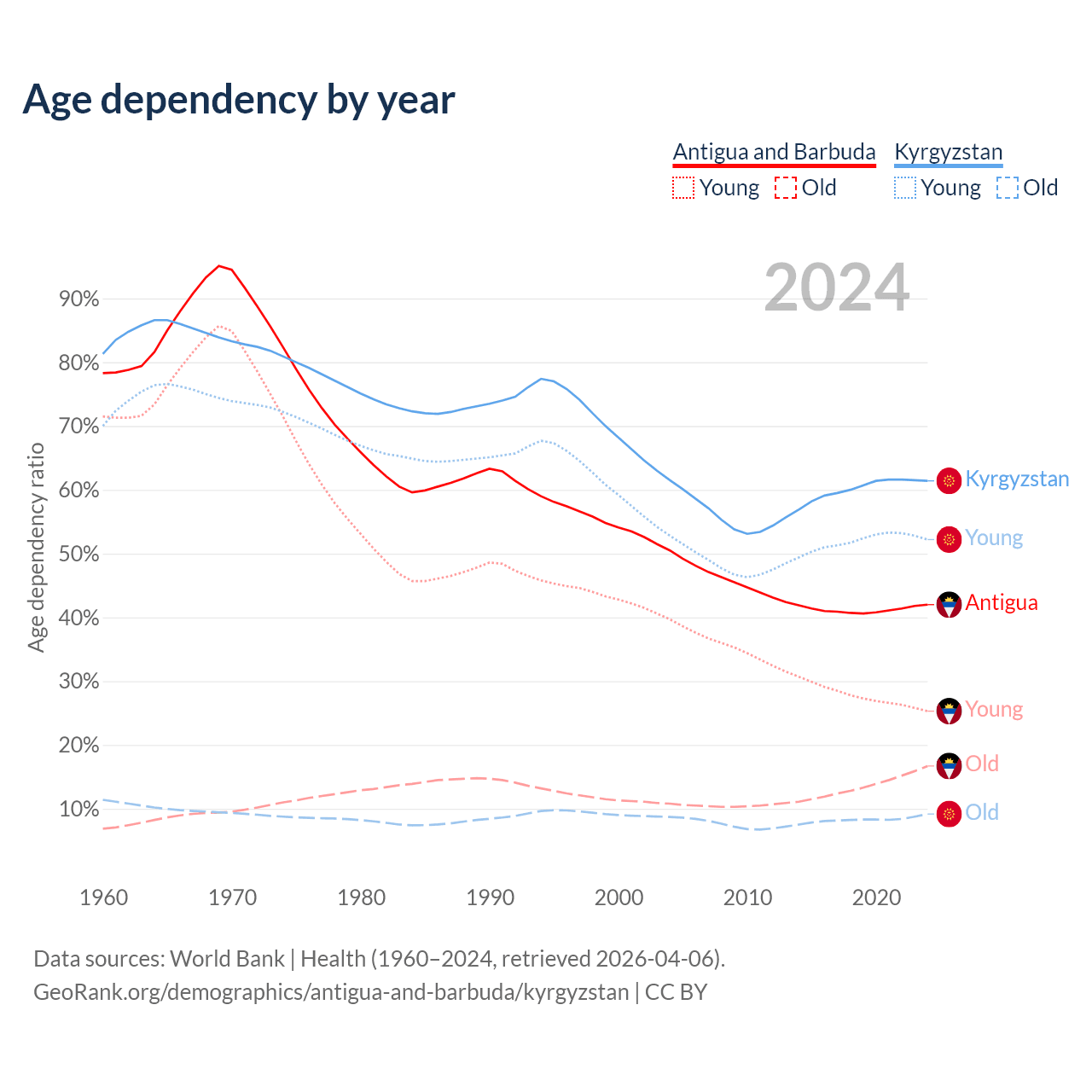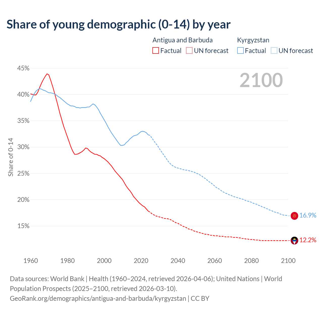 - The share of young demographic (0-15 years old) in Antigua and Barbuda is 17.8% vs 32.3% in Kyrgyzstan.