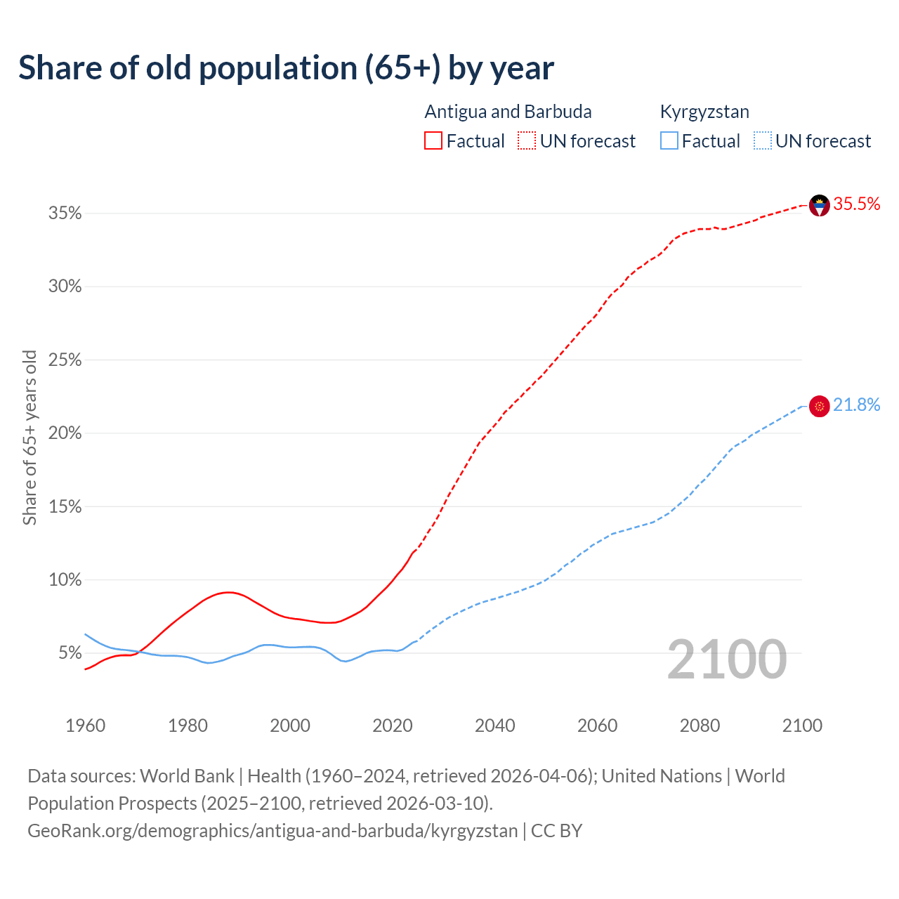 - The share of old-age demographic (65+) in Antigua and Barbuda is 11.8% vs 5.68% in Kyrgyzstan.