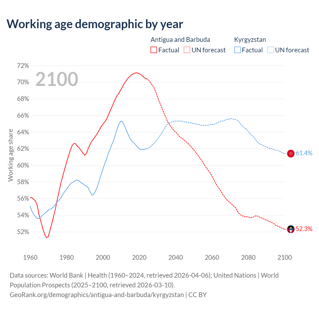 - Antigua and Barbuda has 66.7K working age adults (aged 15-64) vs 4.63M in Kyrgyzstan.