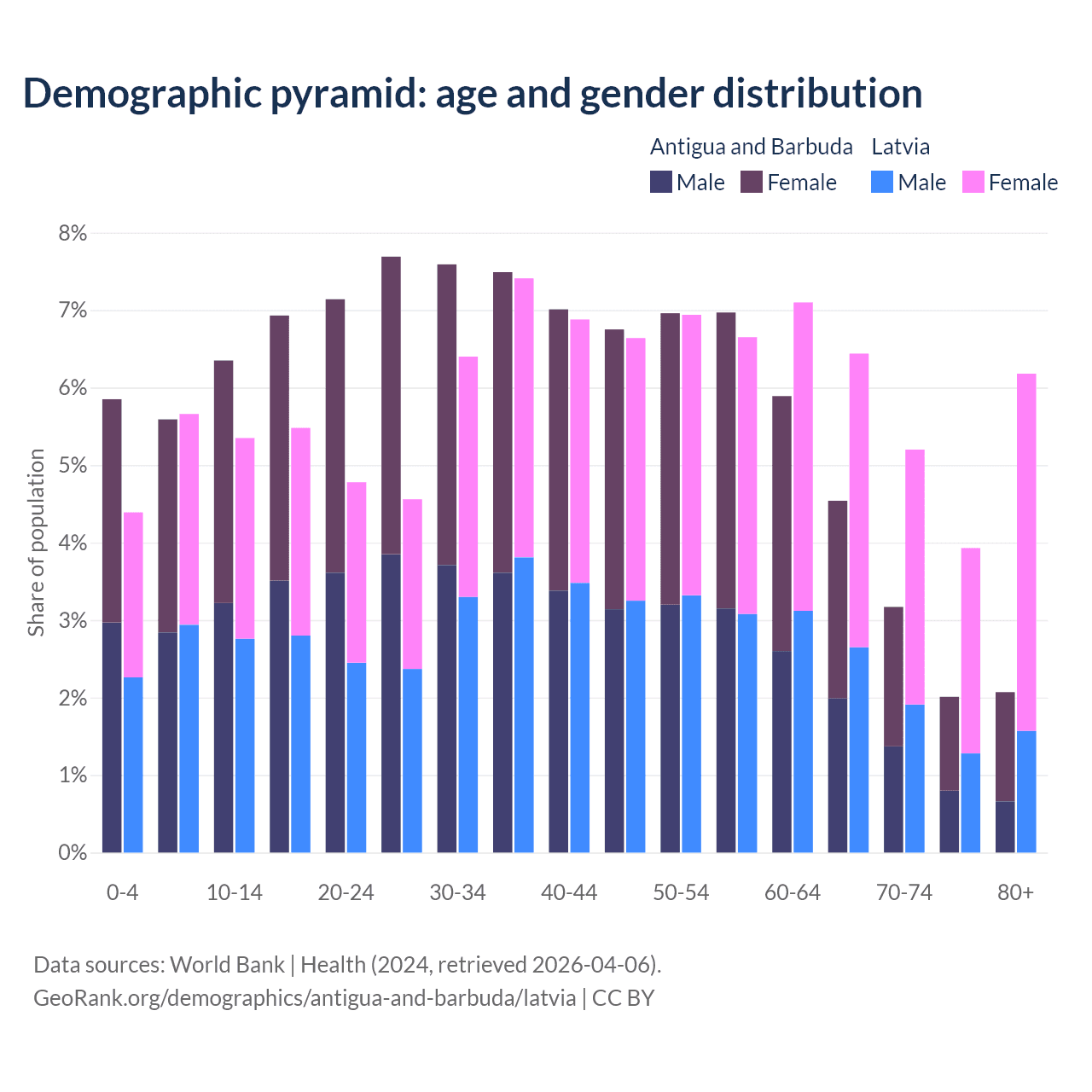 - Antigua and Barbuda is ranked 67/196 by median age (oldest to youngest) vs 20/196 for Latvia.