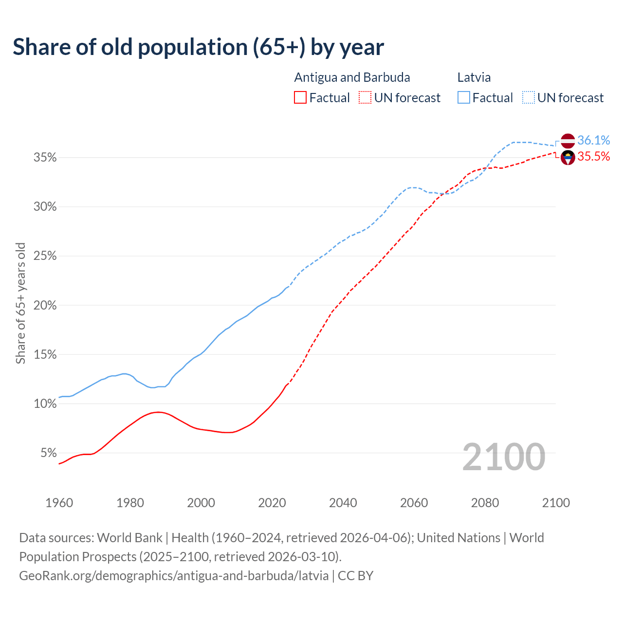 - The share of old-age demographic (65+) in Antigua and Barbuda is 11.8% vs 21.7% in Latvia.