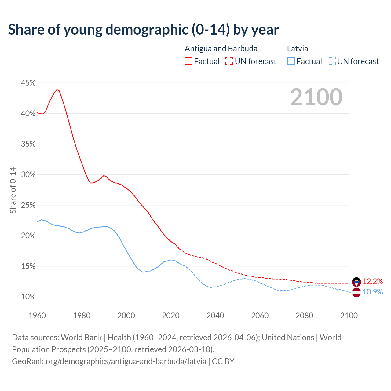 - The share of young demographic (0-15 years old) in Antigua and Barbuda is 17.8% vs 15.4% in Latvia.