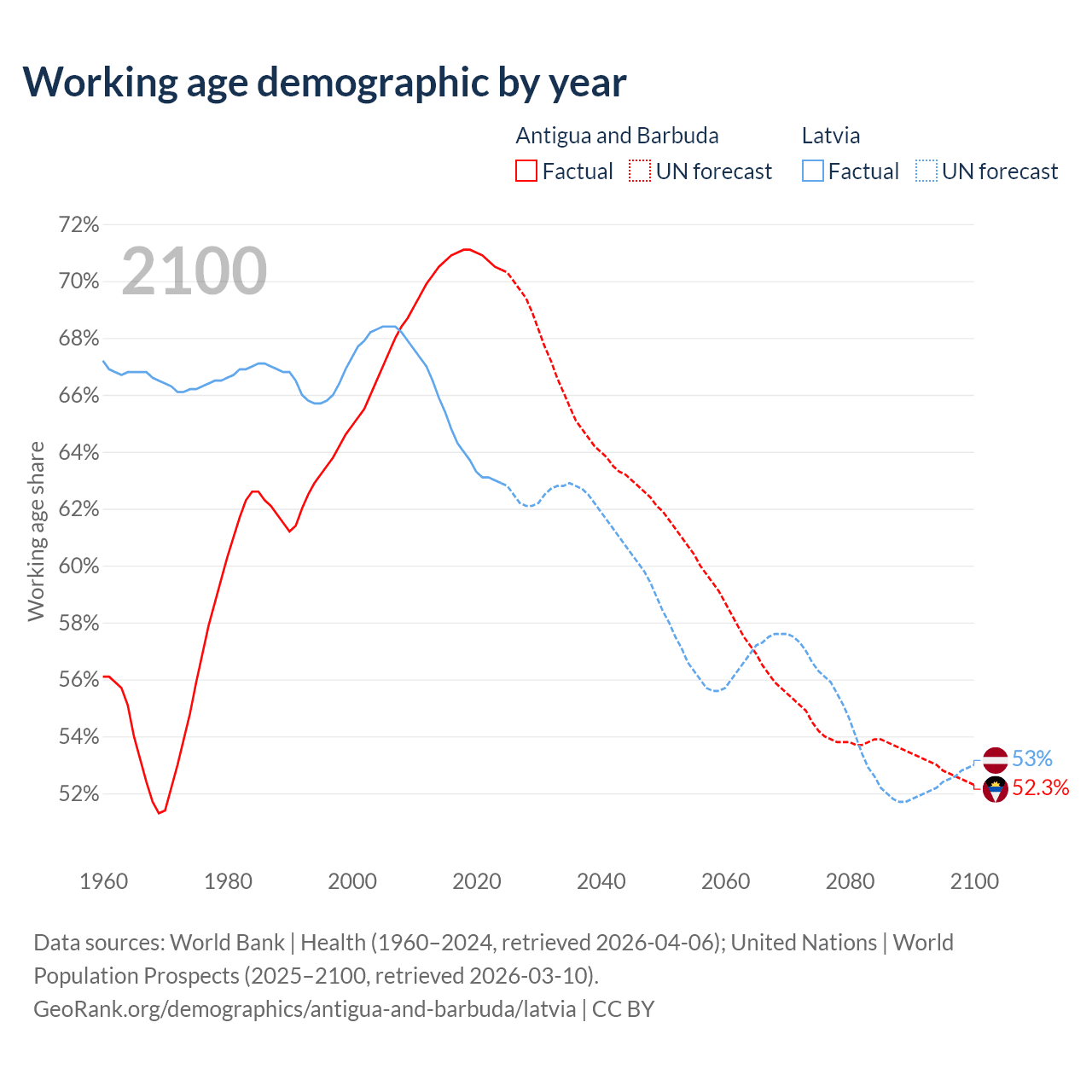 - Antigua and Barbuda has 66.7K working age adults (aged 15-64) vs 1.15M in Latvia.