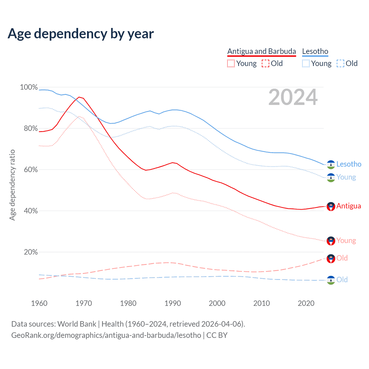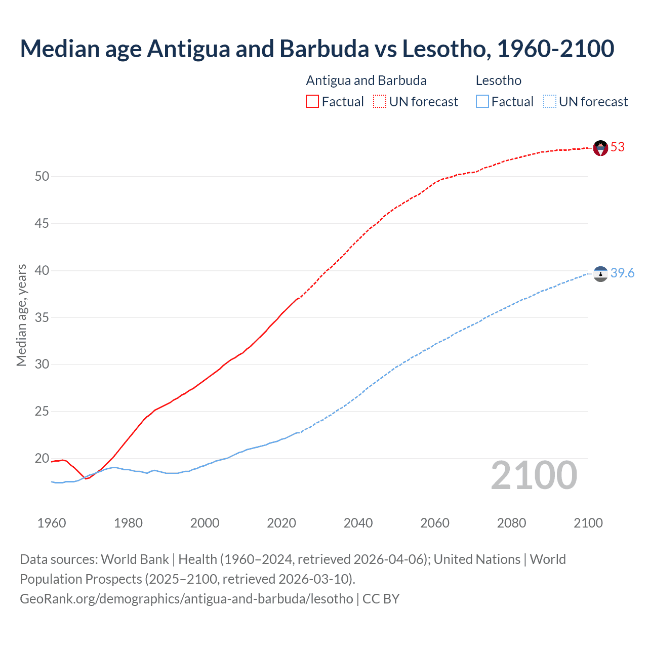 - Antigua and Barbuda is ranked 67/196 by median age (oldest to youngest) vs 143/196 for Lesotho.