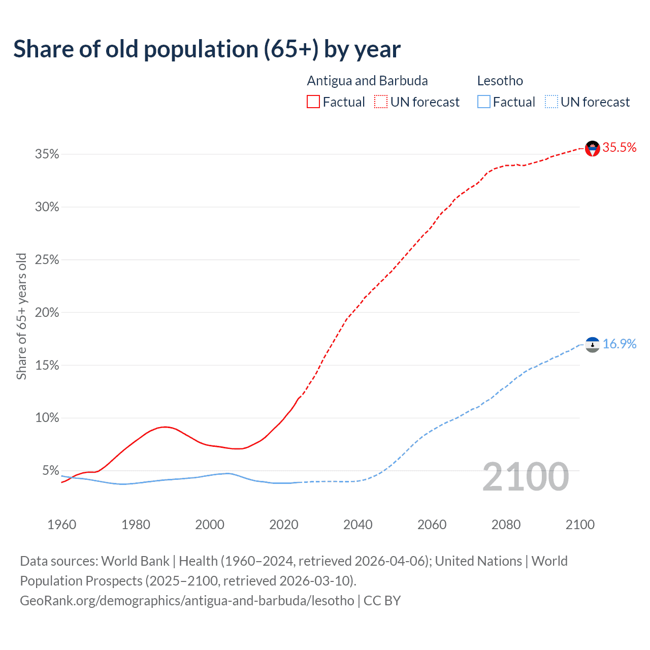 The share of older people aged 65 and over is 11.8% in Antigua and Barbuda and 3.86% in Lesotho. Life expectancy in Antigua and Barbuda compared to Lesotho .