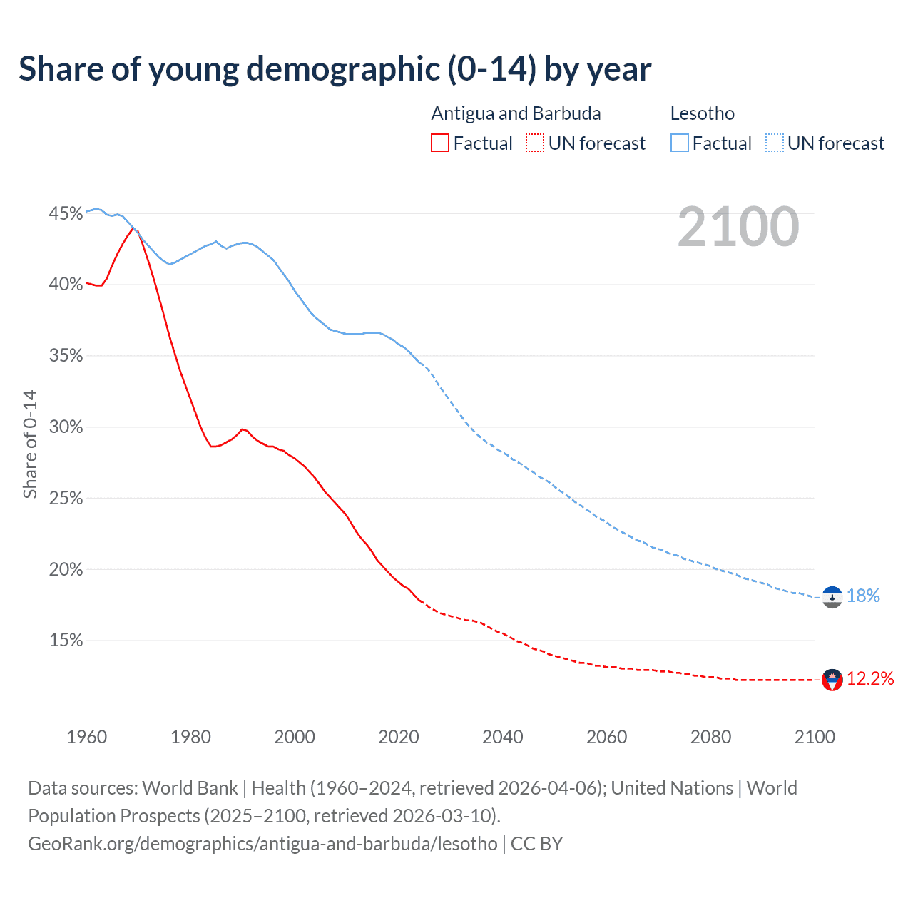 - The share of young demographic (0-15 years old) in Antigua and Barbuda is 17.8% vs 34.5% in Lesotho.