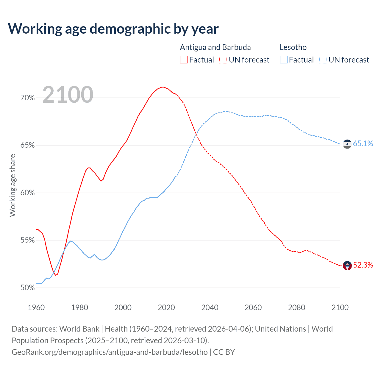 - Antigua and Barbuda has 66.7K working age adults (aged 15-64) vs 1.48M in Lesotho.