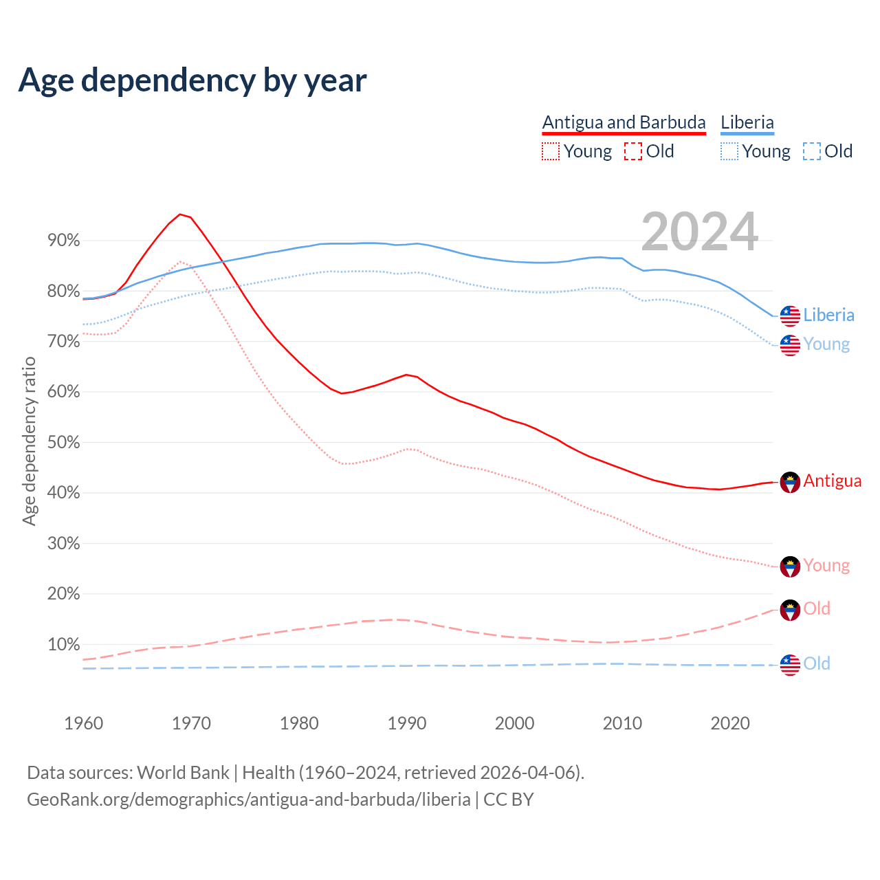 - Antigua and Barbuda is ranked 67/196 by median age (oldest to youngest) vs 169/196 for Liberia.
