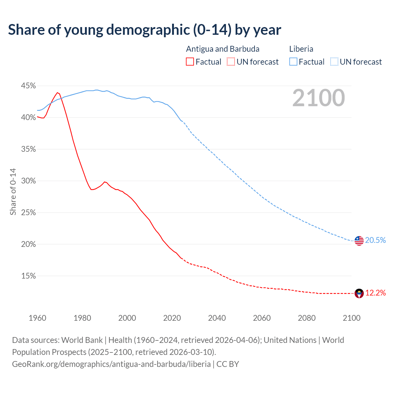 - The share of young demographic (0-15 years old) in Antigua and Barbuda is 17.8% vs 39.5% in Liberia.