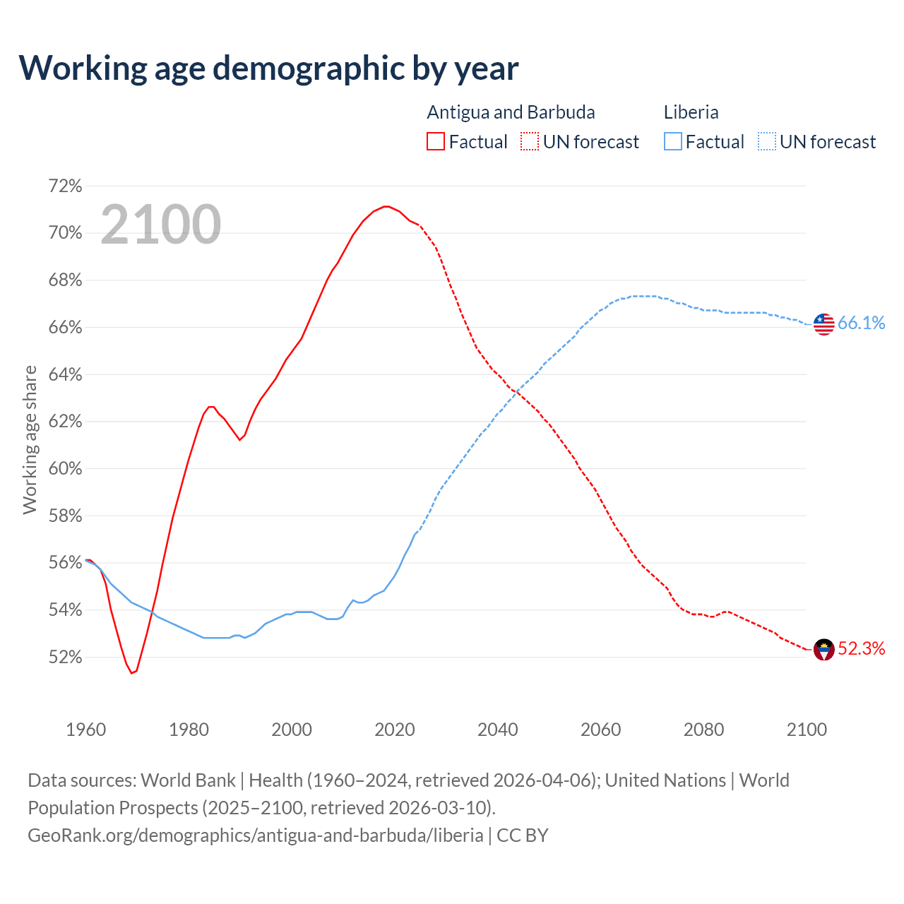- Antigua and Barbuda has 66.7K working age adults (aged 15-64) vs 3.37M in Liberia.