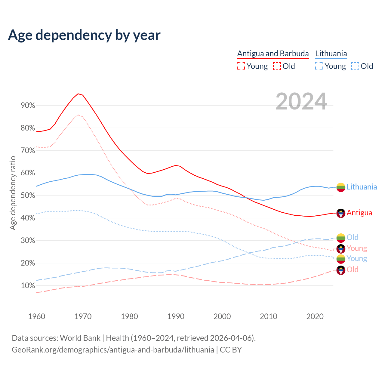 - Antigua and Barbuda is ranked 67/196 by median age (oldest to youngest) vs 28/196 for Lithuania.