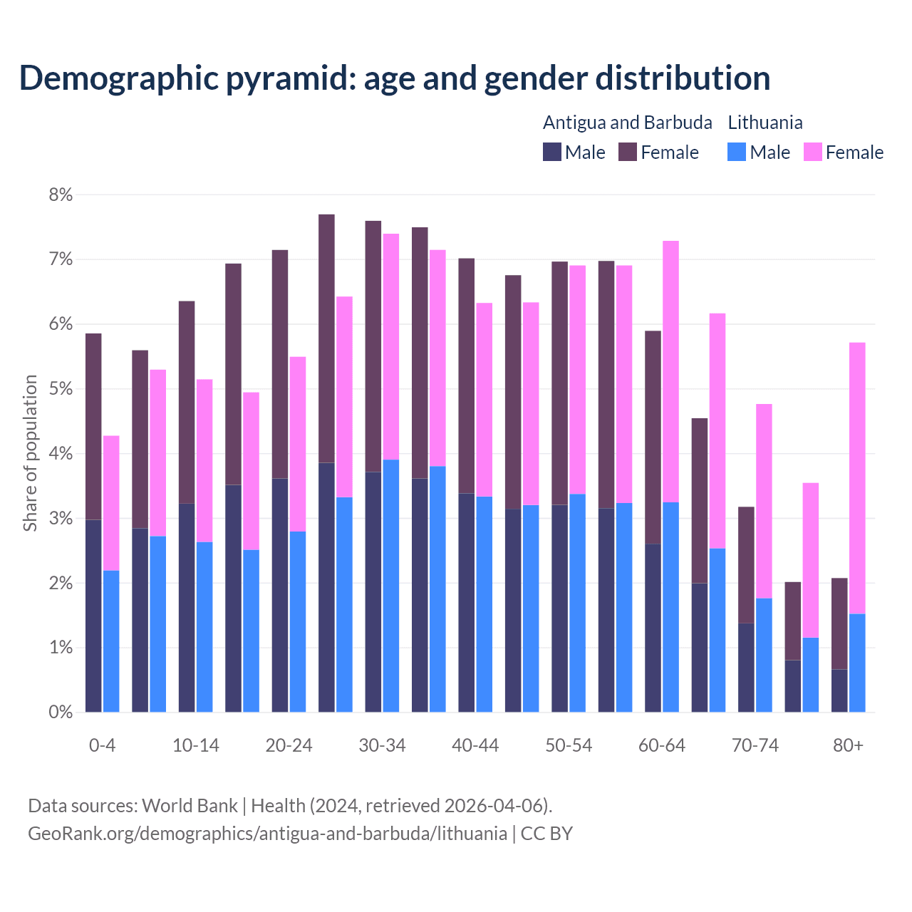 - The share of old-age demographic (65+) in Antigua and Barbuda is 11.8% vs 20.2% in Lithuania.
