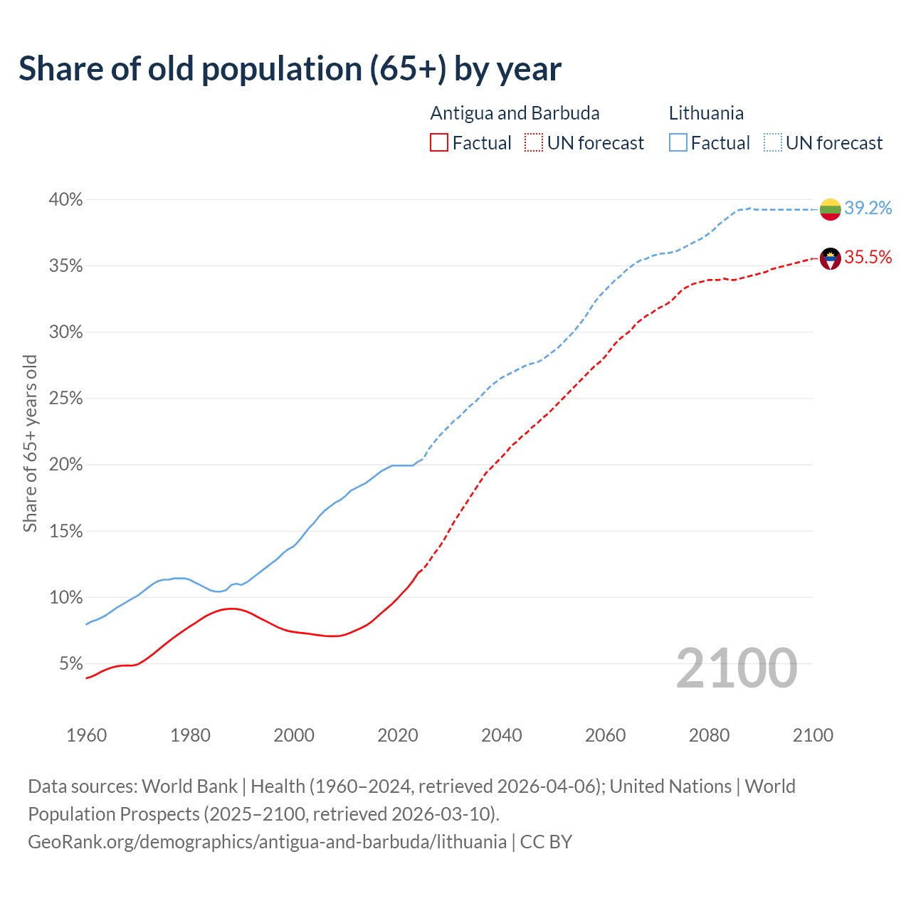 The share of older people aged 65 and over is 11.8% in Antigua and Barbuda and 20.2% in Lithuania. Life expectancy in Antigua and Barbuda compared to Lithuania .