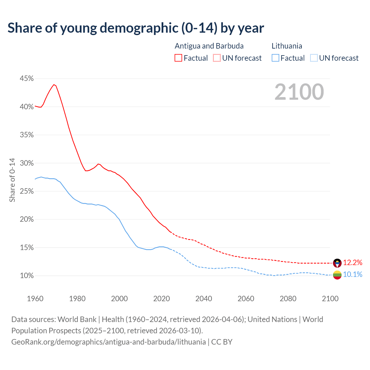 - The share of young demographic (0-15 years old) in Antigua and Barbuda is 17.8% vs 14.7% in Lithuania.
