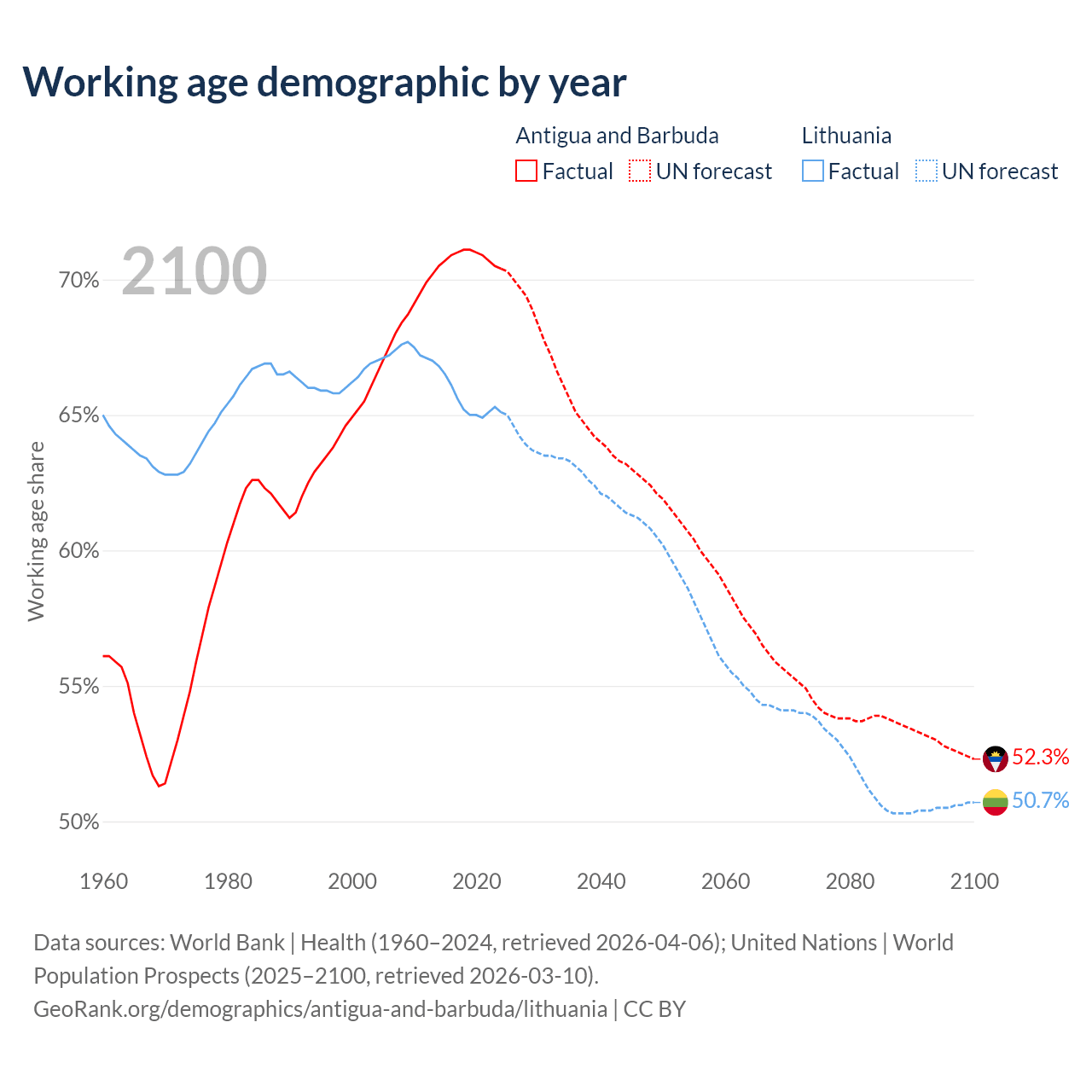 - Antigua and Barbuda has 66.7K working age adults (aged 15-64) vs 1.84M in Lithuania.