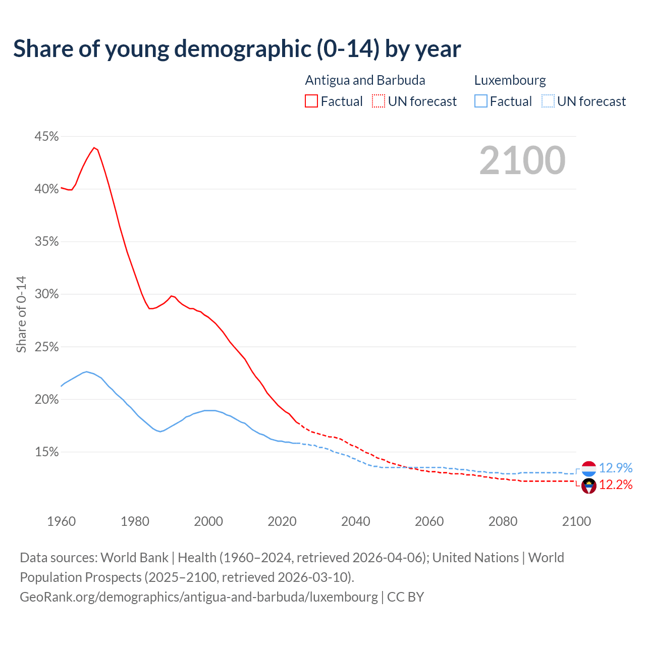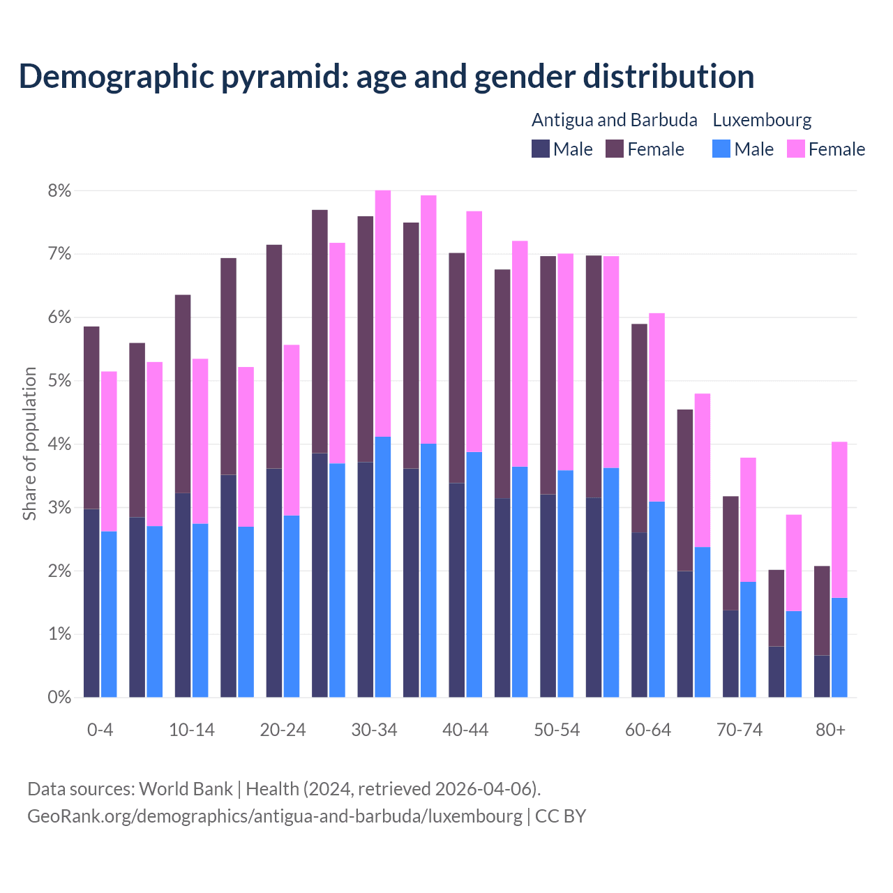 - The share of young demographic (0-15 years old) in Antigua and Barbuda is 17.8% vs 15.8% in Luxembourg.